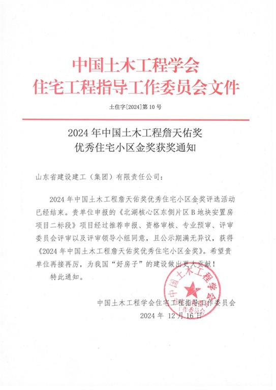 2024年12月,由山東建工集團承建的北湖核心區(qū)東側(cè)片區(qū)B地塊安置房項目二標(biāo)段獲得中國土木工程詹天佑獎優(yōu)秀住宅小區(qū)金獎。今年全國共48個工程獲獎,集團榜上有名。